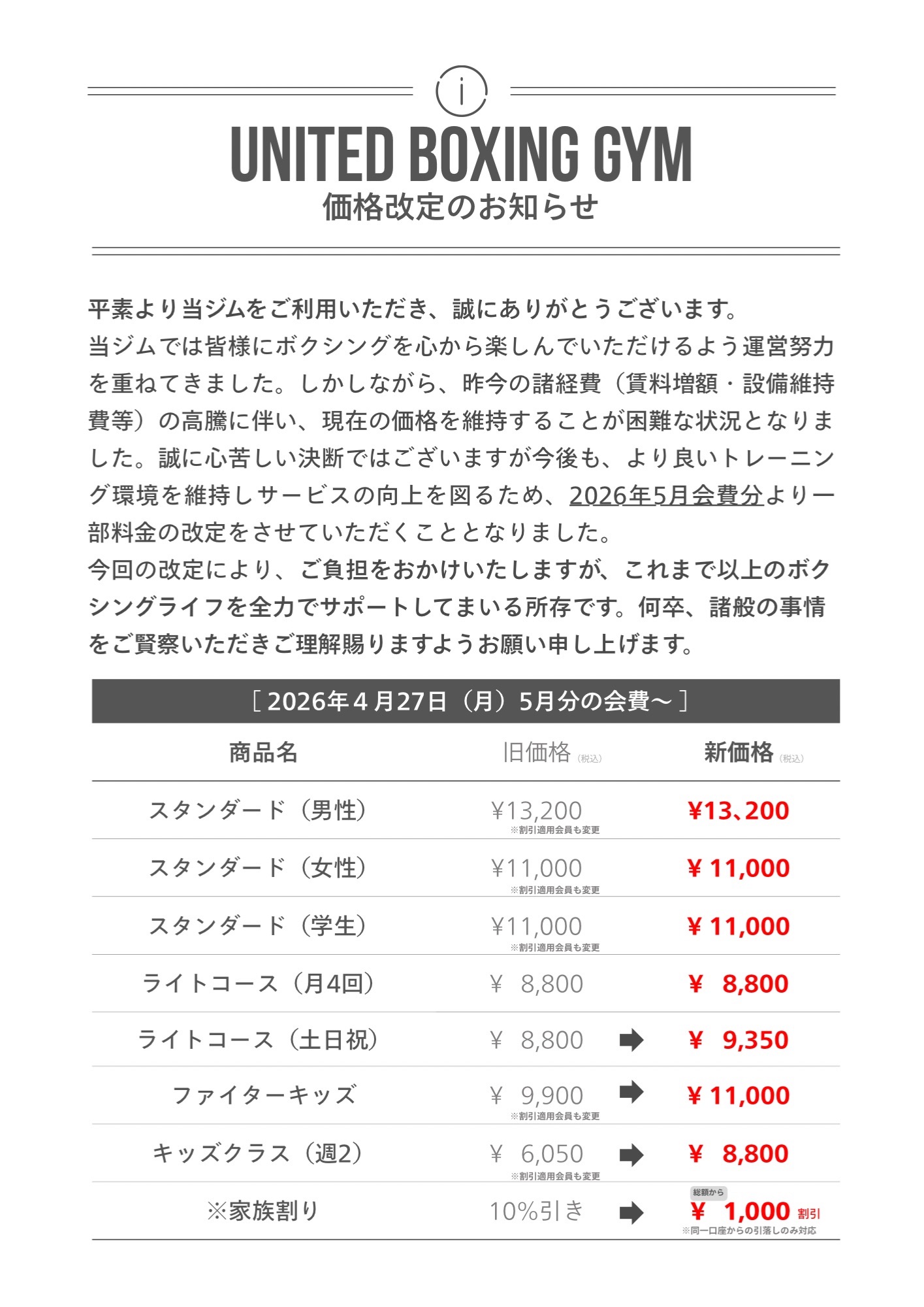 誠に心苦しい決断ではございますが、今後もより良いトレーニング環境を維持しサービスの向上を図る為、2026年4月27日(5月会費)より一部料金の改定をさせていただく事となりました。